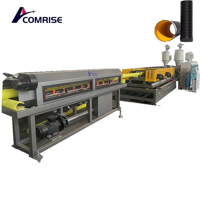 QINGDAO COMRISE MACHINERY CO., LTD Направете двойна стена, гофрирана машина за изработка на тръби от двойна стена, гофрирана с тръба машина, внимателно разработена от нашата компания, чрез модула за задвижване на предавките, охлаждане на водата във водното корито на формиращата машина, продуктите са с въздушно охлаждане, така че производството на скоростта на формоване на удари, еднаква горна форма, гладка вътре и извън стената. Скоростта на производство е 8-30 метра в минута. PVC PE PE гофрирана тръба Производствена линия Пластмасовата гофрирана тръба е много широко използвана в ежедневието ни, може да се използва като тръба за резба, тръба за източване, тръби, шиша тръба, свиваща се тръба и т.н.